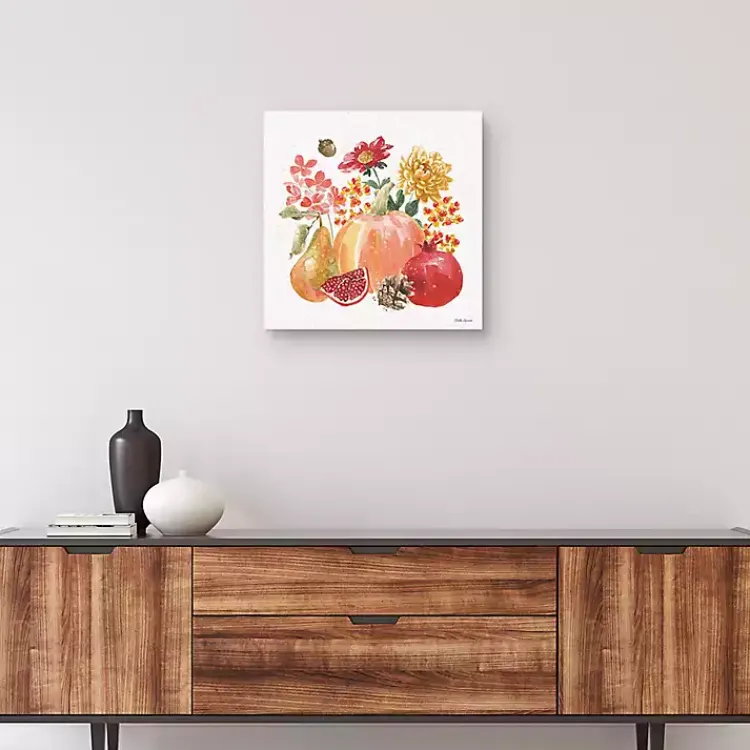 At the heart of this Harvest Fruits Bounty Canvas Art Print lies a large sugar pie pumpkin. This print perfectly capture the essence of the harvest season.