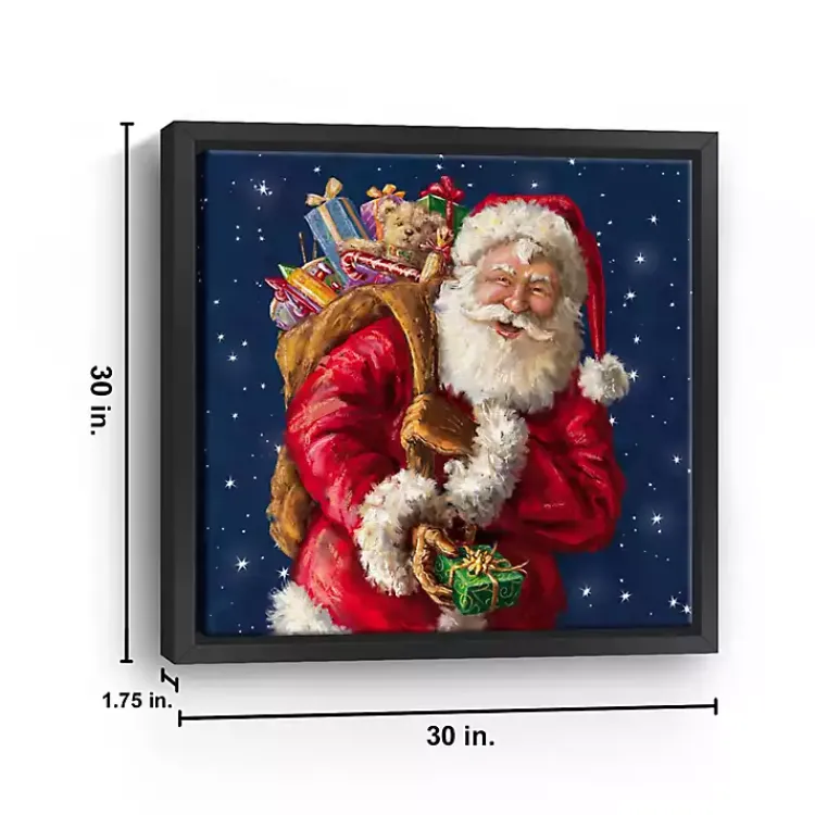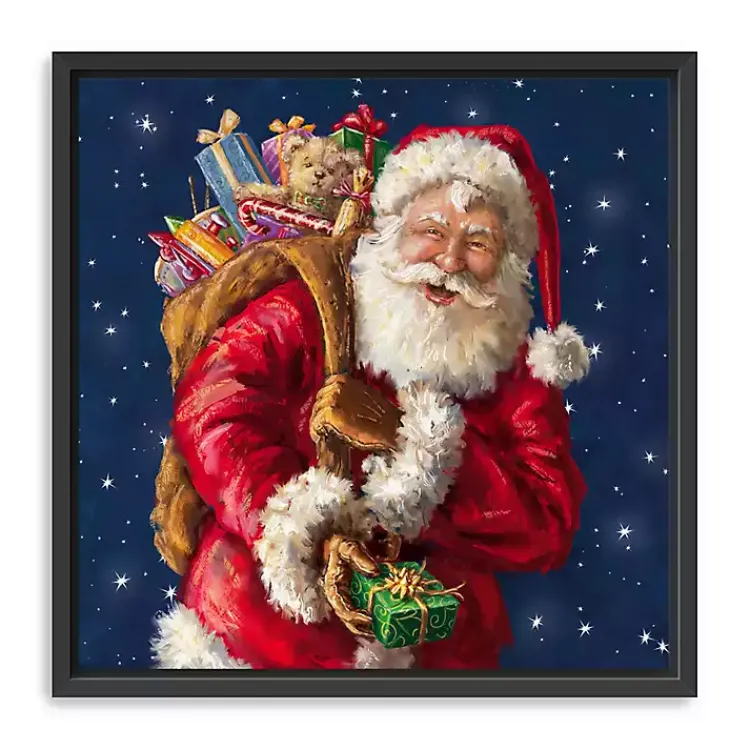 Santa Claus is coming to town! With its magical charm, this Smiling Santa with Gifts Framed Canvas Art Print will bring a holly, jolly look to your home!