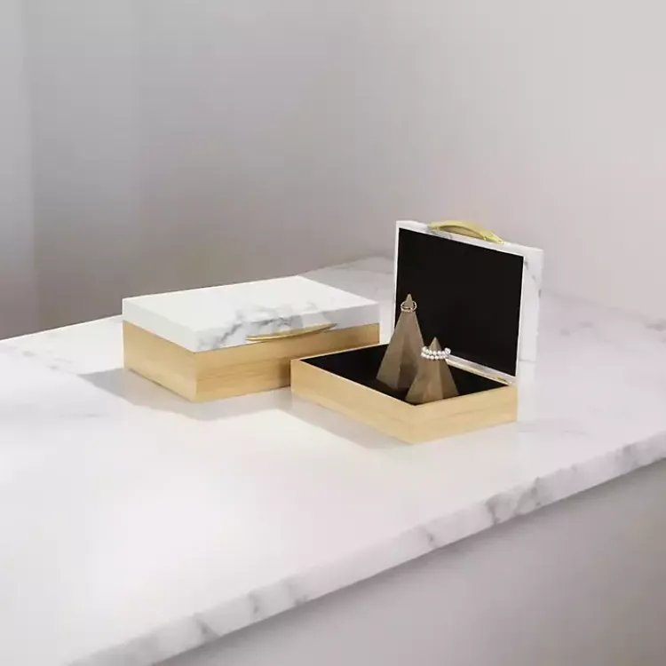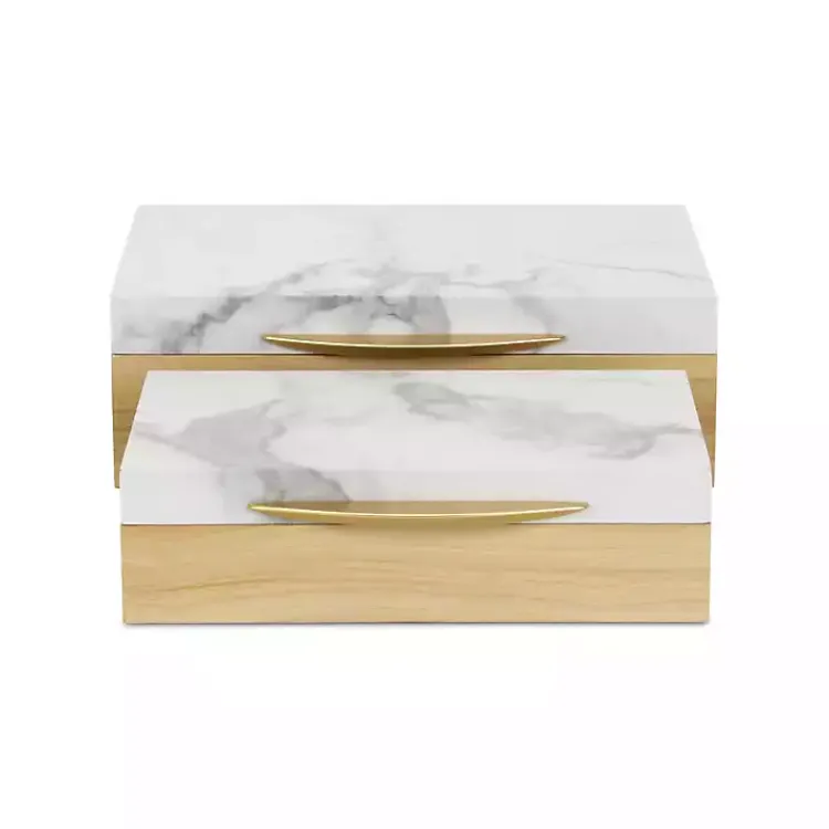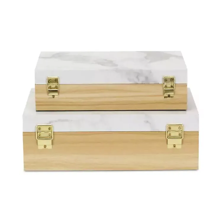 Deliver modern flair to your room with our Wood and Faux Marble Rectangular Boxes, Set of 2. This practical set stylishly keeps your keepsakes out of sight.