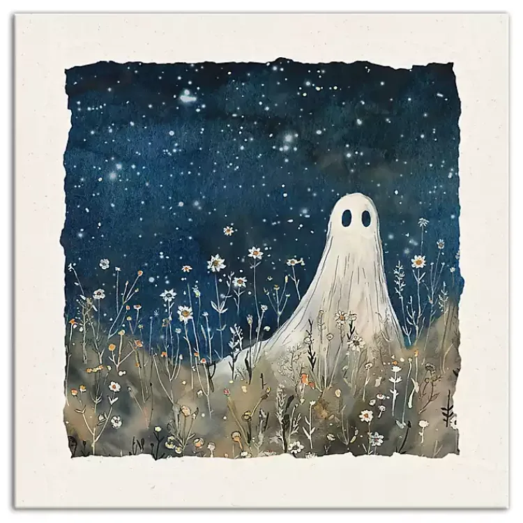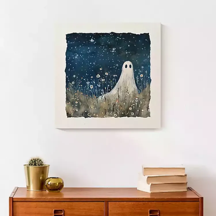 Let this Stargazing Ghost Canvas Art Print haunt your halls this Halloween. The cute ghost surrounded by stars and flowers will bring an ethereal touch to your home!