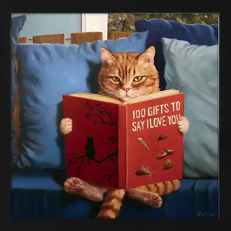 Cats show love in their own way, and this kitty is deciding which gift he should leave on your pillow. Our Love Language Framed Art Print will bring comfort and humor to your home!