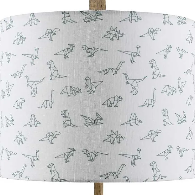 - Hardback cylinder shade in white fabric with geometric, dinosaur details