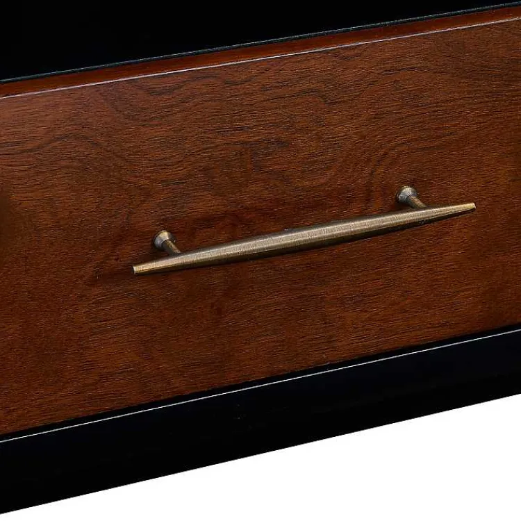 Elevate your space with the mid-century modern style of this Black and Brown Wood 2-Door Media Cabinet. It has plenty of space for your TV, gaming console, and other entertainment accessories!