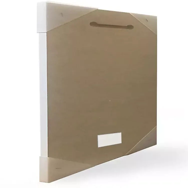 - Cream wooden frame around wrapped canvas