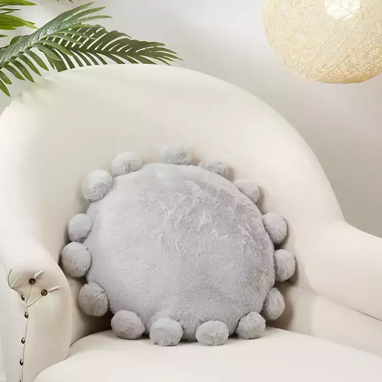 Accent your home with this Gray Faux Fur Round Pom Pom Throw Pillow! The soft faux fur is perfect for getting cozy on your couch. The pom poms will bring a fun look to your space that you’ll love!