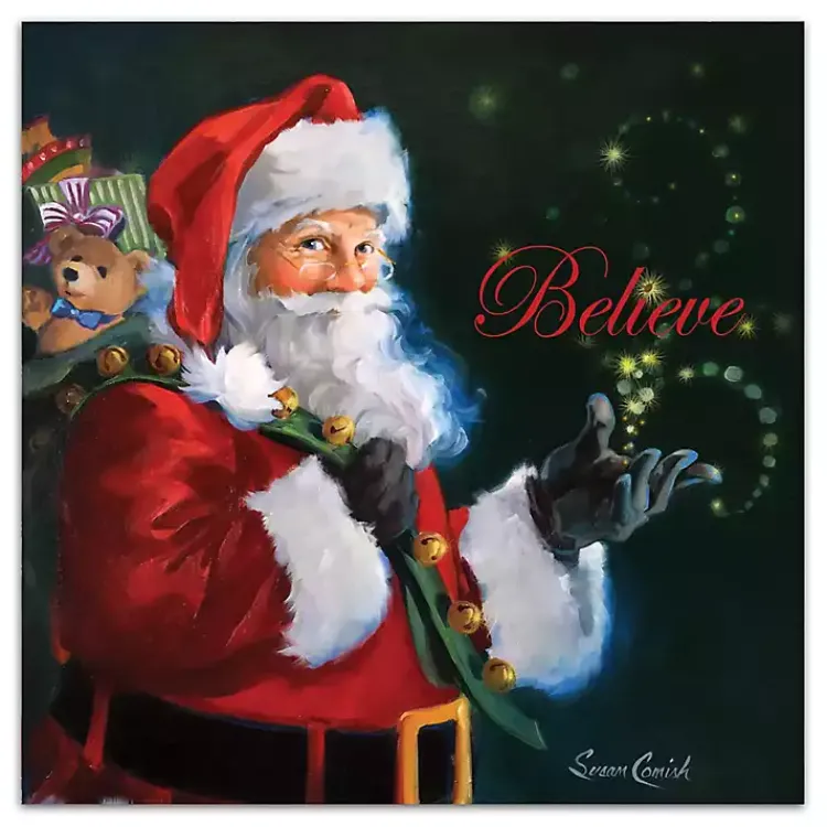Keep the magic of Christmas alive with this Believe Santa Claus Canvas Art Print. This enchanting scene of St. Nick holding a toy bag will look perfect hanging above the fireplace.