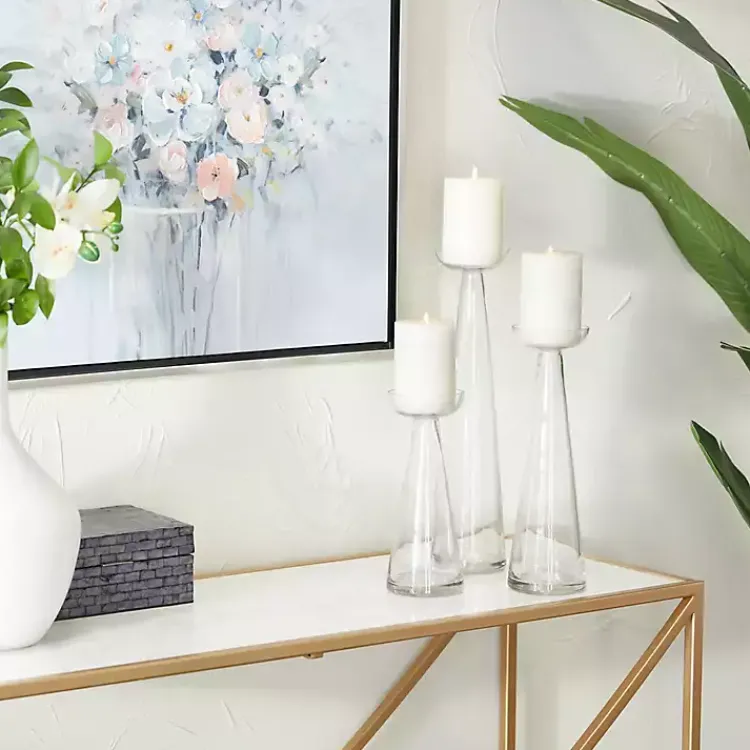 Elevate any basic candles with these Tapered Glass Pillar Candle Holders. Their clear, glossy finish gives them a timeless style that will look great in any space!