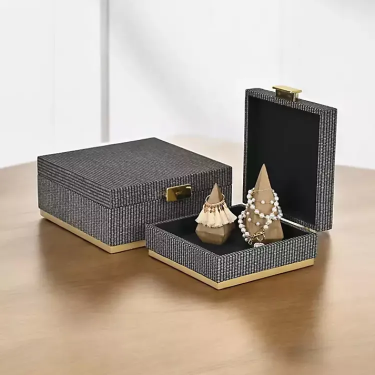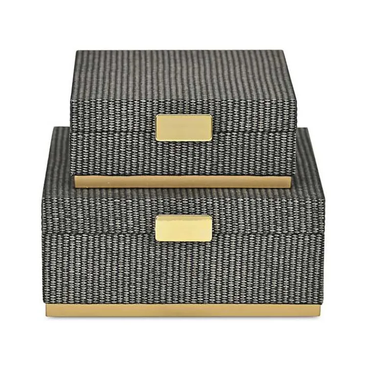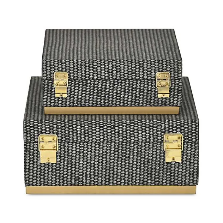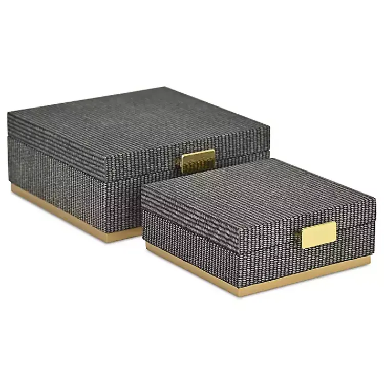 Protect your keepsakes in style with our Gray Woven Square Boxes, Set of 2. The darker woven pattern and gold accents make this set the perfect addition to any moodily decorated space.