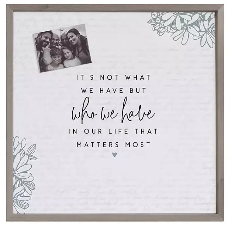 - Reads “It’s not what we have but who we have in our life that matters most” with floral details