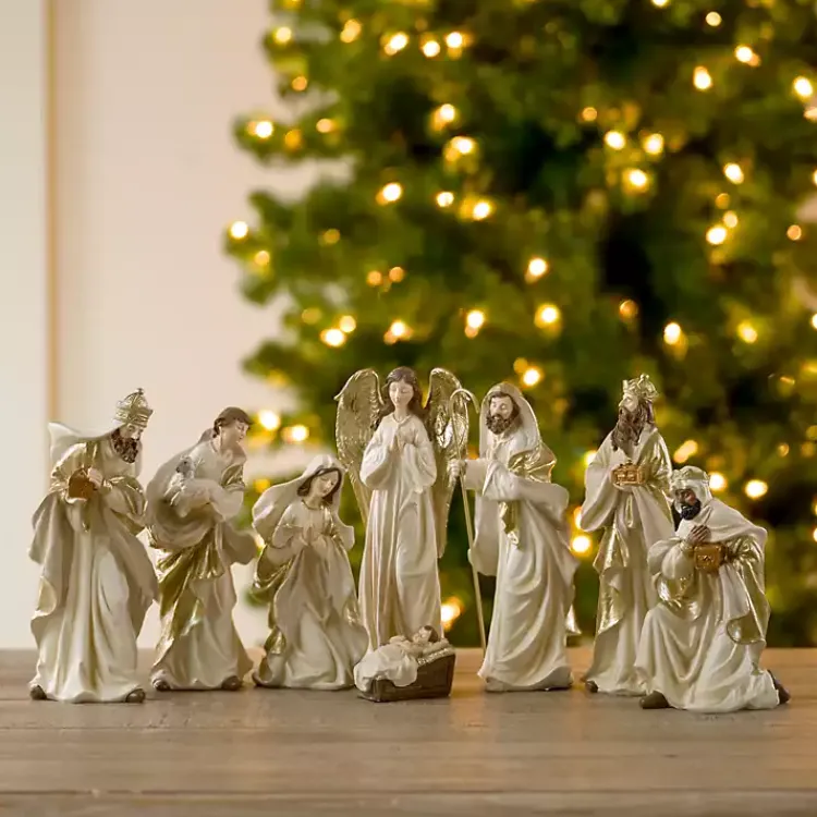 Celebrate the holy family this Christmas with our Cream and Gold 8-pc. Nativity Set. Its light finish and golden details will create a beautiful display all season long!