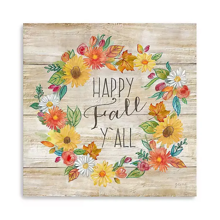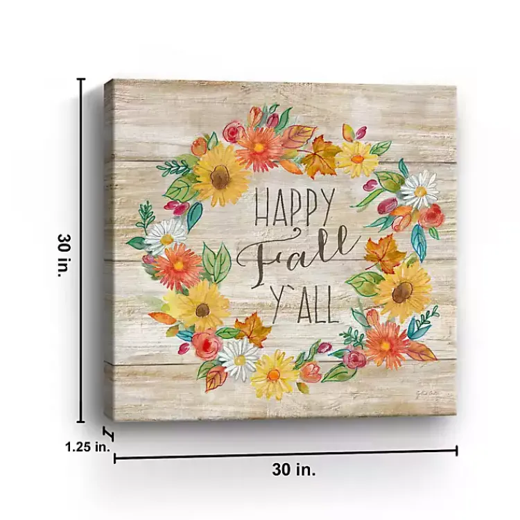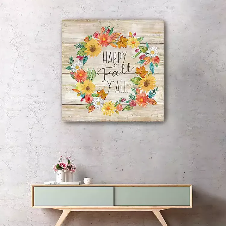 Our Happy Fall Y’all Wreath Giclee Canvas Art Print welcomes the fall season with true country charm. Liven up your entryway with this cheerful, colorful piece!