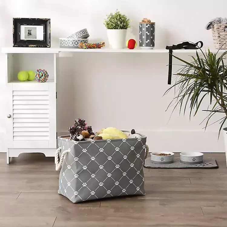 Keep those dog or cat toys out of sight with our Gray Paw Trellis Rectangle Basket! This sturdy basket features a charming design that won’t disturb your existing decor.