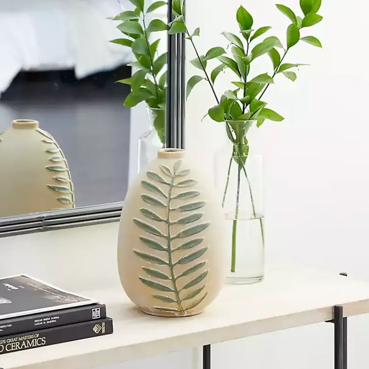 The Tan Raised Green Fern Ceramic Vase features a raised green fern on an earthy, tan background. Add a single flower stem to create a minimal statement piece.