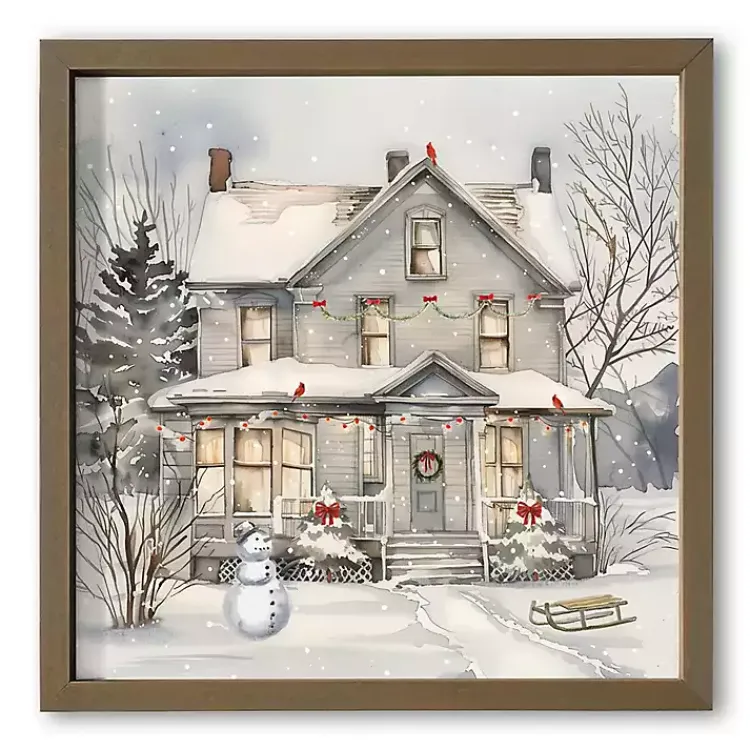 Dreaming of a white Christmas? This Neutral Holiday Home Framed Art Print will keep in theme with your modern winter wonderland. Showcase this festive winter scene above your fireplace.