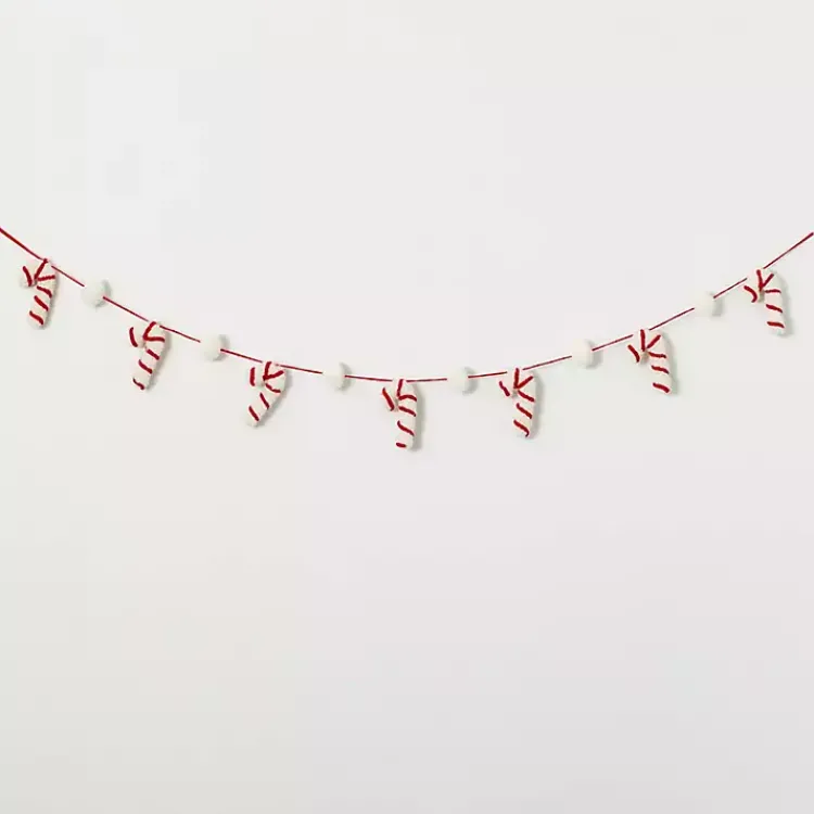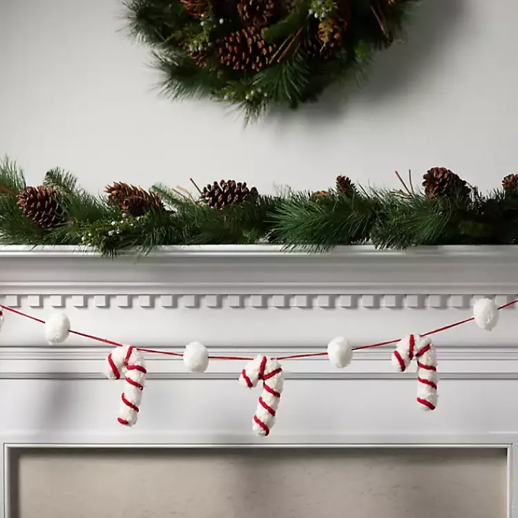 This Whimsical Candy Cane Garland brings a jolly dose of Christmas cheer. Featuring red and white striped candy canes interspersed with white pompoms, it will get everyone in the holiday spirit.