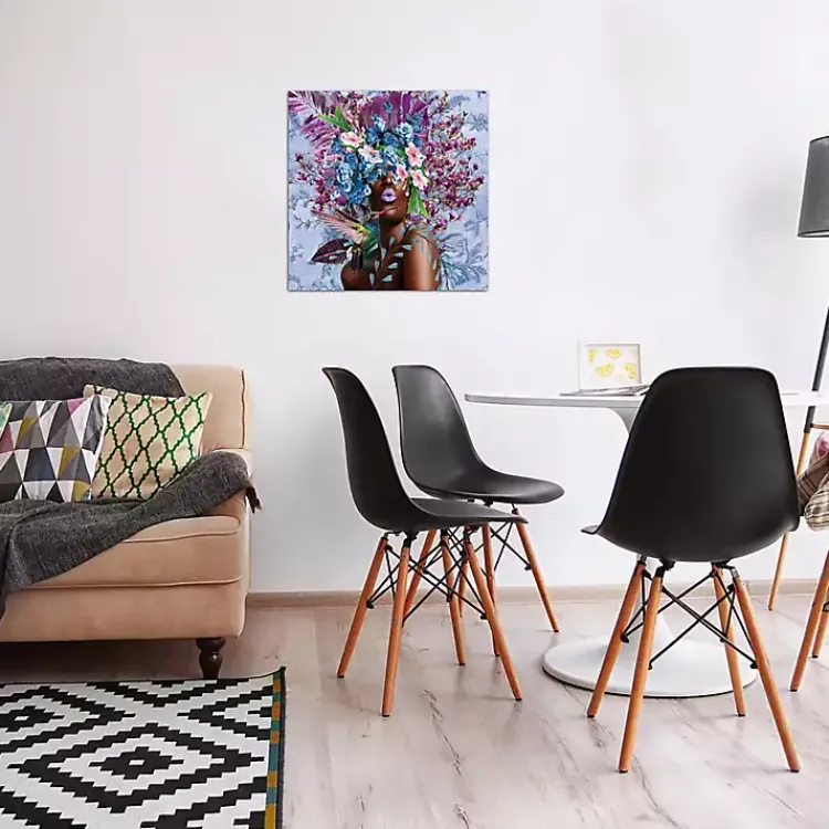 Embrace your wild, whimsical art style with this Woman in Bloom Purplicious Giclee Canvas Art Print. Showcasing a fashionable figure engulfed in flourishing flowers, this statement piece enlivens any space!