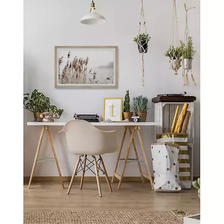 Complement your wall space in a breezy way! Featuring neutral colors and unique edging, our Deckled Lakeside Grass Framed Art Print is a calming piece.