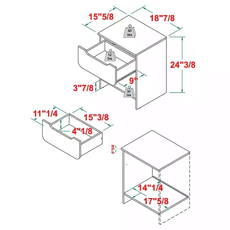 - Nightstand measures 18.9L x 15.6W x 24.4H in.