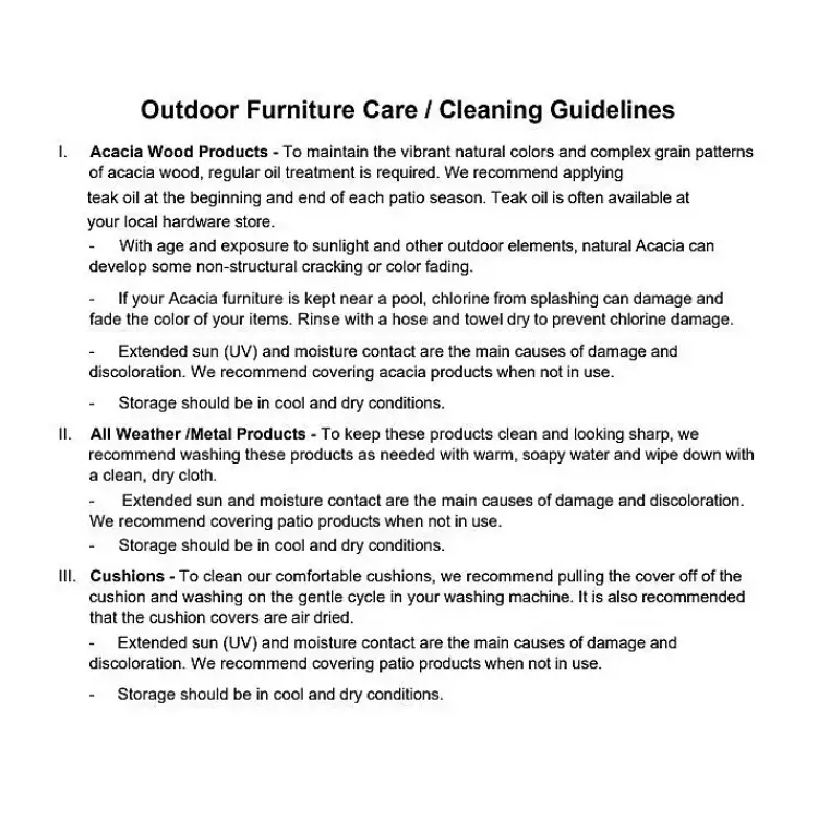 - Care: See “Care Instructions” section below. Safe for outdoor use.