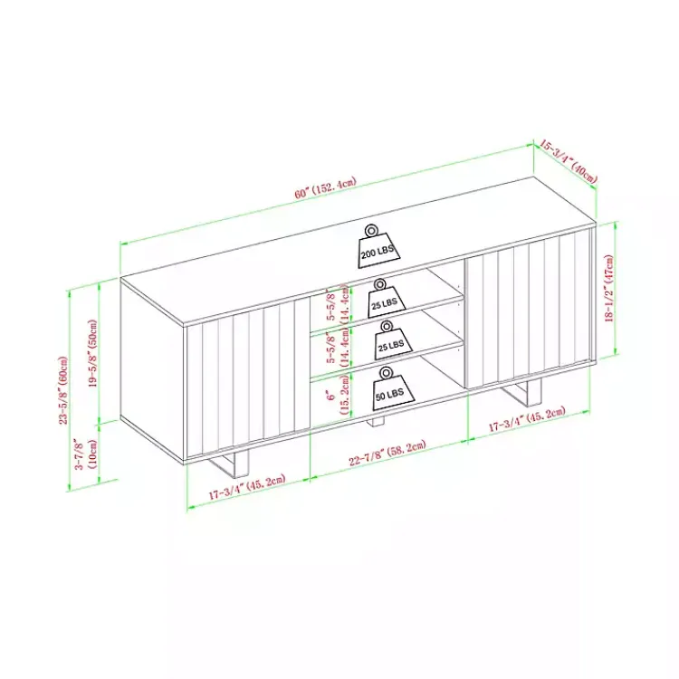 - Cabinet measures 60L x 15.75W x 25.63H in.