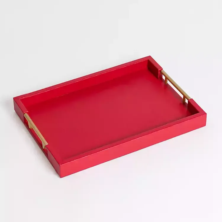 Add a decorative flair to your coffee table or countertop with this Red Faux Leather Gold Handle Tray. Its smooth, angular design beautifully displays candles, books, and other decor!