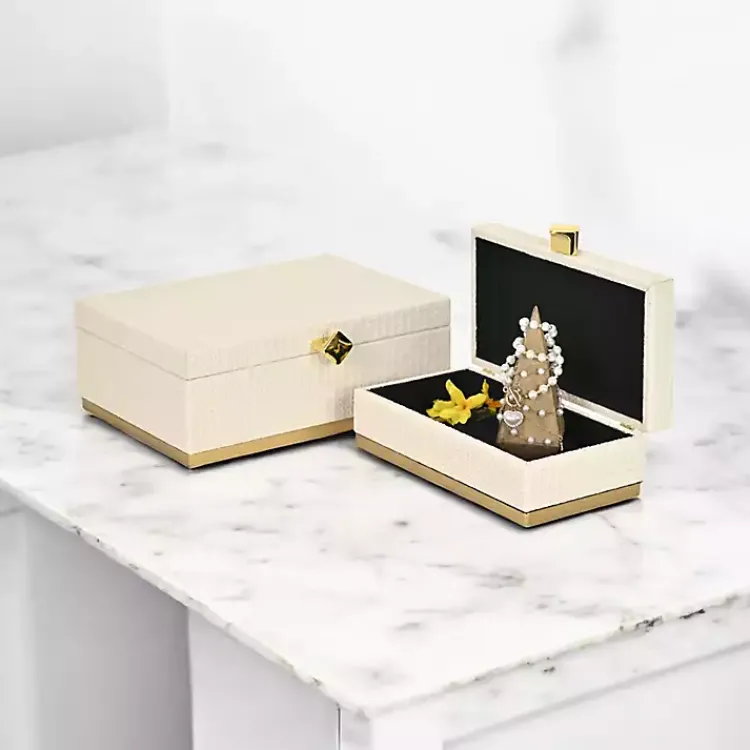 Our White Vinyl Rattan Rectangular Boxes, Set of 2 will embellish your space with luxurious style. Featuring a white rattan pattern and gold accents, this set will earn praise from all your guests.