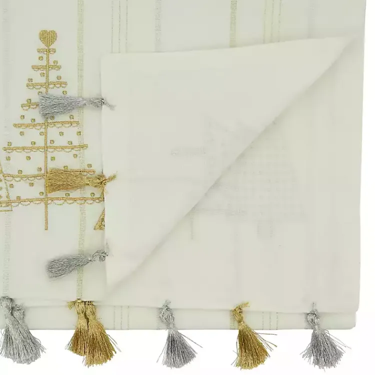 Give all your holiday meals a festive backdrop using this White and Gold Christmas Tree Table Runner! The gold and silver tasseled ends will add a whimsical touch to your tabletop!