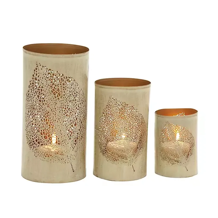 Accent your space with our Gold Leaf Metal Candle Holder Set! You’ll love adding candles to create a soft glow through the leaf designs and metallic finishes.