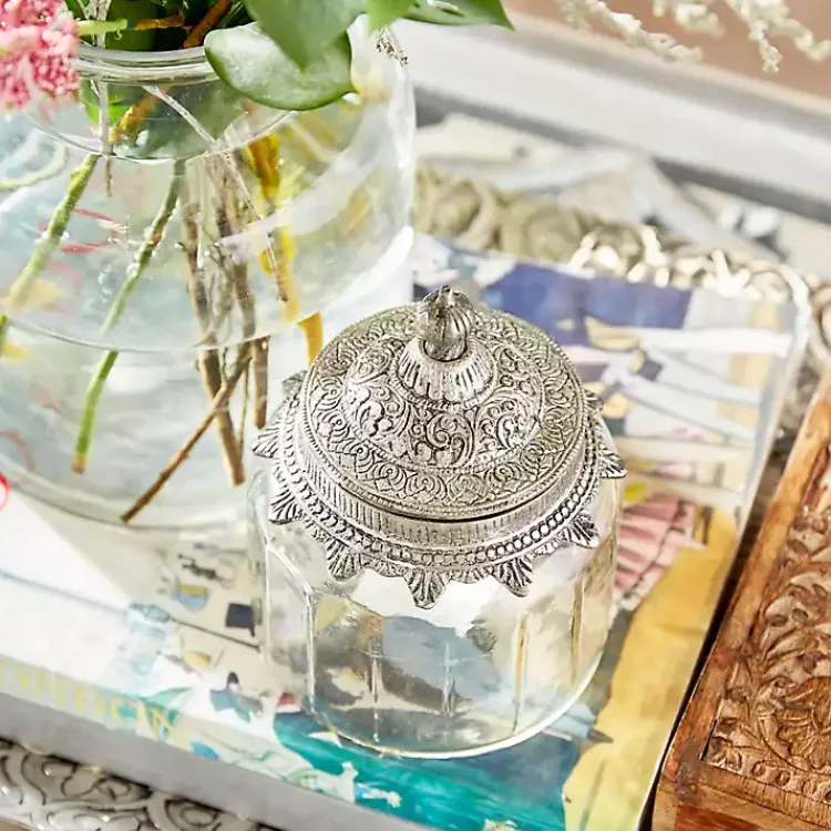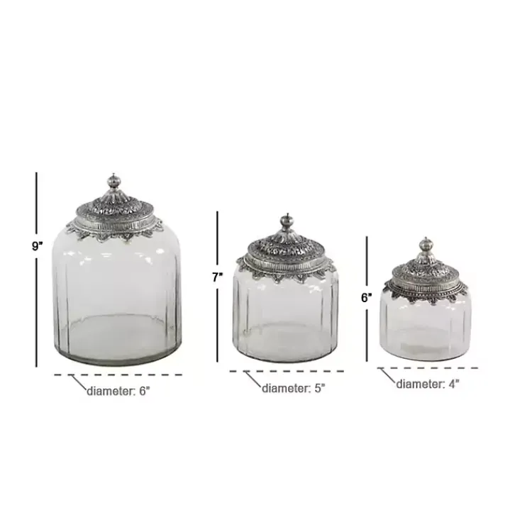 These Clear Glass Jars with Decorative Lids will make an ornate accent in your home. Use them for some beautiful storage in any space, from the bathroom to the kitchen!