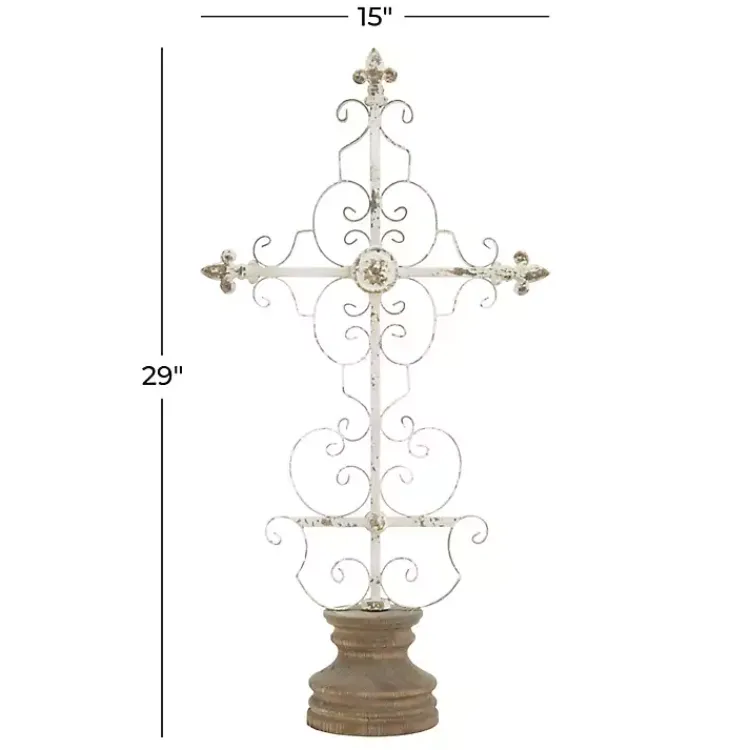 You’ll love the antique and elegant look of this Cream Metal Ornate Cross Tabletop Sculpture! This cross is accented with scroll details and fleur-de-lis for a French country-inspired touch.