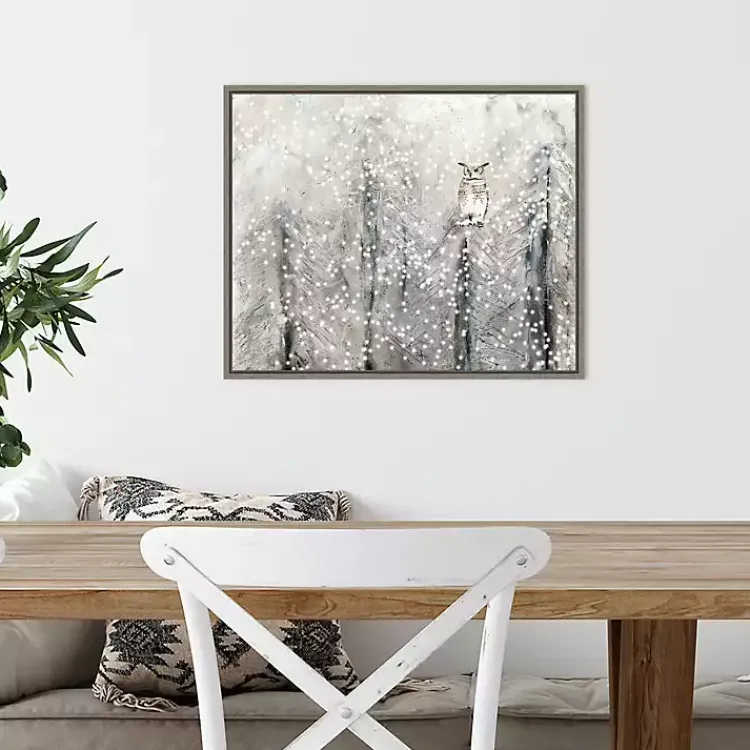 The Snowy Scene with Owl Canvas Wall Plaque gorgeously captures the calming beauty of a winter forest. Style it with your farmhouse or cabin décor for a festive, frosty touch!